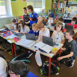 Today 3rd and 4th classes helped 1st and 2nd classes as they worked on the chrome books for the first time.