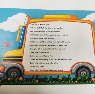 Today one of our bus drivers Tony retired. We will all miss Tony. To show this we all gathered outside and cheered for Tony. We read our memories of journeys on his bus and a poem.